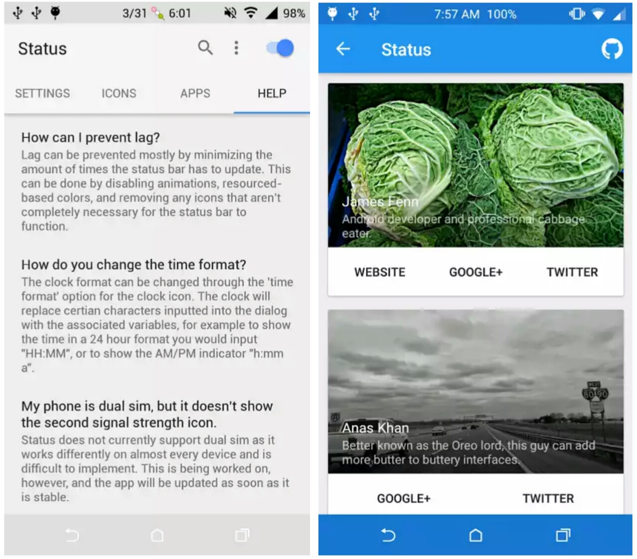 Status is another cool Android app that can painlessly replace your device’s status bar with something more cool . The app works by drawing an overlay on top of your status bar. In this way the actual system-generated status bar is hidden under the replacement. Status brings the same similarity with an app known as material status bar. However the latter offers more advanced features. To get going with status, you’ll need to grant the app some permissions that can enable it to obtain needed information to display on your status bar. Once done, you’ll be greeted with a refined status bar that tends to auto color-match with currently running apps.