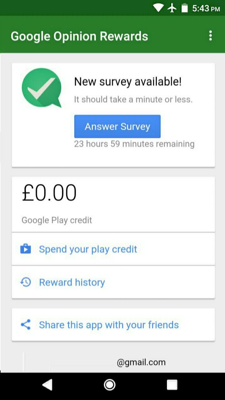 Surveys have limited time, they can even disappear between 20 hours if you didn’t answer them quickly. Now if you want to get more surveys, you’ve to visit places such as the grocery store etc. Google will send you surveys once a week, although it may be more or less frequent. When a short & relevant survey is ready for you, you can receive up to £0.60 in Play credit for completing it. Surveys may take time to appear depending on your location. Enjoy your money!!
