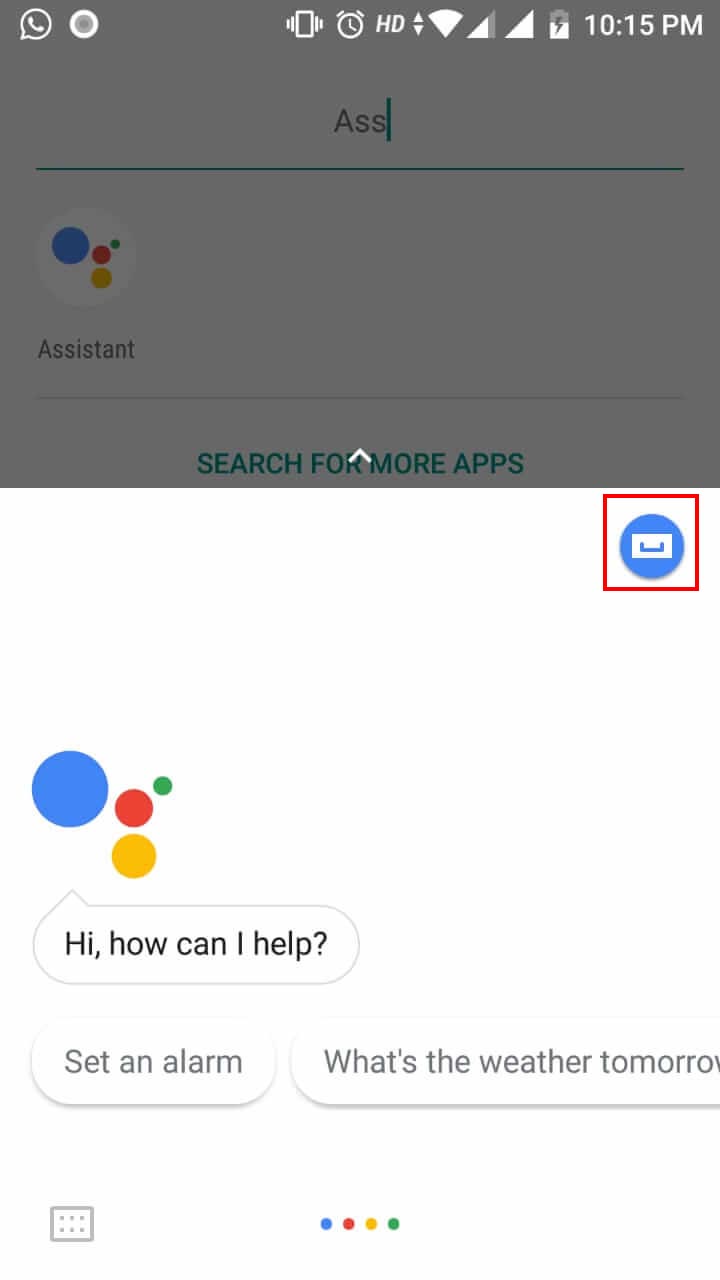 - Open the Google Assistant App and click on the blue button on top of the white box that pops up (as shown below).