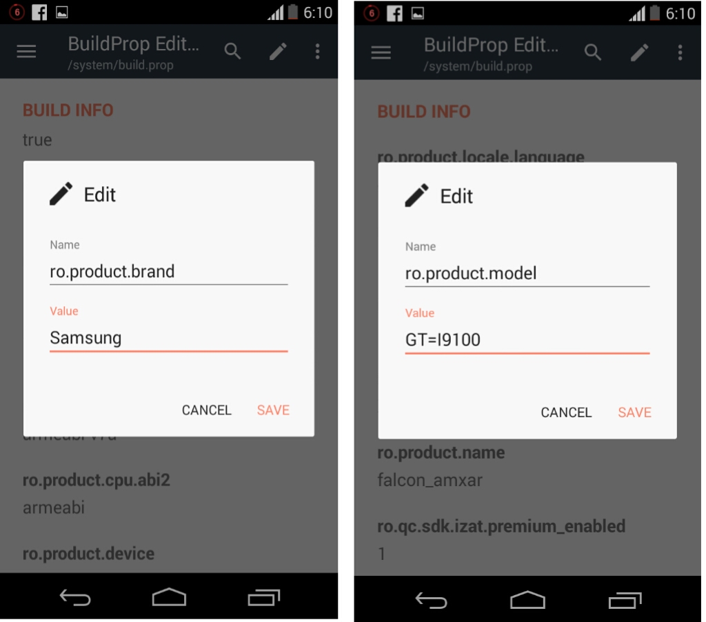 Next you can either scroll down or rather use the search icon to find this text ro.product.model and also ro.product.brand. Since they’re the only important file we need to tinker with in other to achieve our aim. Now you’ve to edit and rename this line to pretend your device is another model. For example to imitate Samsung Galaxy S2 use this line…