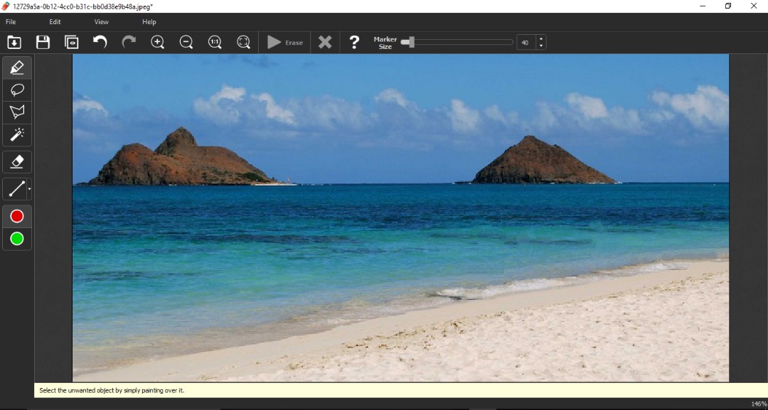 Now it’s time to get rid of the photobombs. Inpaint offers handy tools that can help to remove objects from a photograph easily. From the inpaint top menu, we have Open, Save As, View Original, Undo, Redo, Zoom In, Zoom Out, Normal View, Zoom to fit, Erase, Clear Selection etc. Now to remove unwanted people from the image you just uploaded, simply drag the marker or brush to select the people or objects you want to remove.