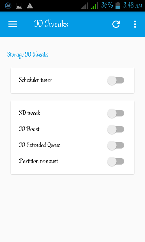Next is the IO Tweaks, this option can improves the performance of your android phone with a little more battery draining in counterpart. However you can choose to toggle the “IO Boost” which in turn improves the performance without reducing the battery life. Other option can be toggled to see there various functions.