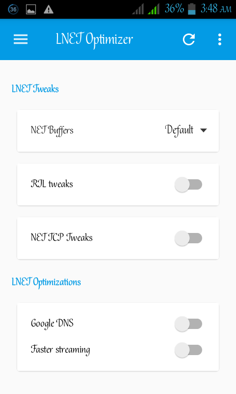 The LNET Optimizer improves the network browsing performance.If you choose the small “Net buffers”,  it will increase the network buffers size reasonably for each connection but if you choose the big net buffers, the increase will be much bigger and it may affects your battery life while using your network. So toggle other options to your preference.