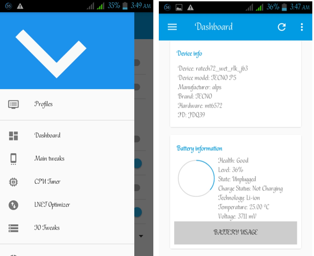 Now swipe the screen from the left or tap the three horizontal line at the upper left corner of the screen. Tap the dashboard section and from there, you can see your device, battery, memory CPU and kernel information.