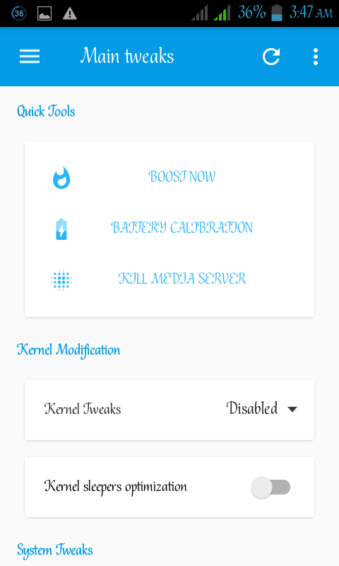 From the app main menu again, tap the “Main tweaks” option and you can see some options to tinker with. The “kernel tweaks” improves your device battery life and performance by changing the kernel related tunables with new values while the “Liquid Smooth UI” improves the user Interface performance, with a little more battery draining. You can toggle other options to see there various functions.