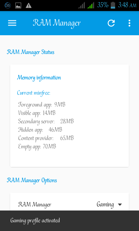 The RAM Manager offers a little but important function here, once you choosing the multitasking option or gaming option, then your device can blend with this and improve your device activities. However you can choose the balance option to keep things at equilibrium.