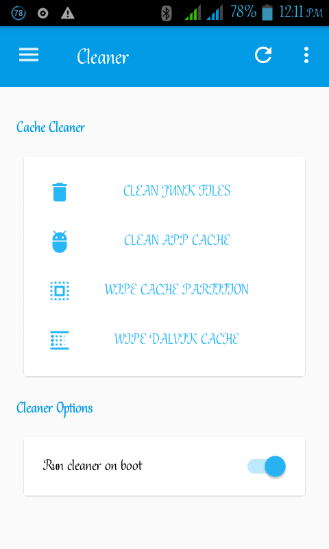 The cleaner option comes in handy too, however by intuition you can easily figure out what there functions are. You can toggle the “Run cleaner on boot” to help removes the junk and obsolete files generated by the system  during your device booting process.