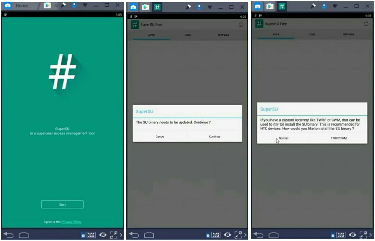 Now open SuperSU and click on the “Start” button. From here, click “Continue” from the pop-up to update the SU binary. On the next screen you will get a pop-up asking you how you will like to install the SU binary. Simply click on “Normal”.