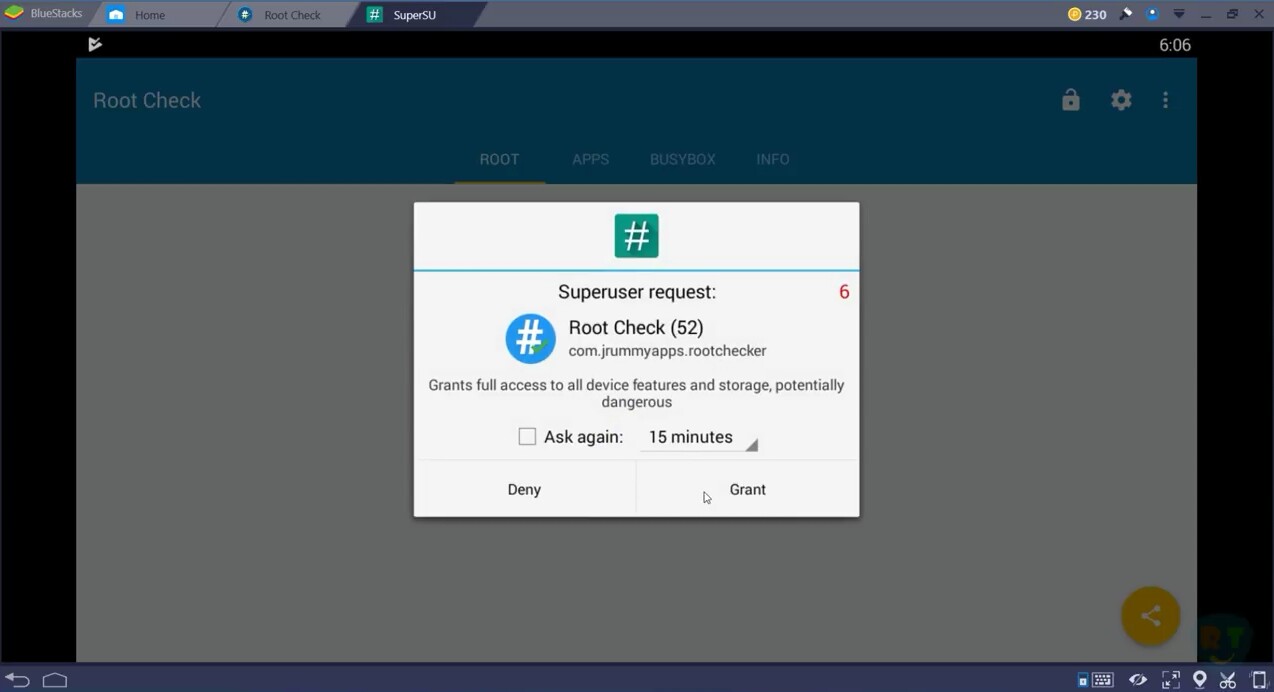 Now open “root check” and grant super user request. Then you’ll see that your BlueStacks is properly rooted.