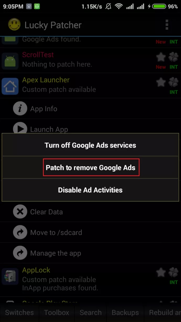 The pop-up menu (in lucky patcher) will unveil a ton of different options for you to dive into, but we aren’t here to play around. So tap on the “Open Menu Of Patches” to continue. From here, you’ll see a similar but different pop-up menu that also brings essential options. Select the “Remove Google Ads” followed by “Patch To Remove Google Ads” which you’ll see on the next window.