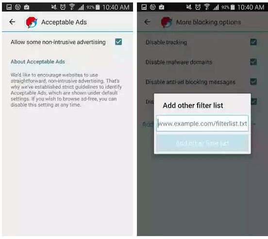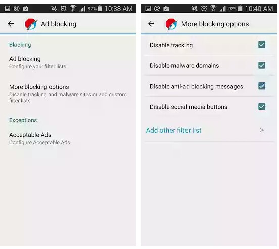 Adblock Plus can block intrusive popups and annoying ads on Facebook, YouTube, Android apps, games, browsers and more without requiring any root access. Just as Adguard, installing Adblock Plus will also require “Unknown Source” enabled from your device. Simply head over to Settings -> Application or Security and enable the option. Once you’re done, download the AdBlock Plus app and install it on your Android device.
