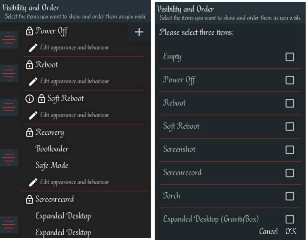 #5. The visuality and order is the most essential part of tinkering you need to do in other to add more options to your power menu. Click on visuality and order, on the next page you will notice the plus + sign close to the power off, click on it. Â A drop down menu will appear, Now select the item you want to show at the power menu and order them to your taste.