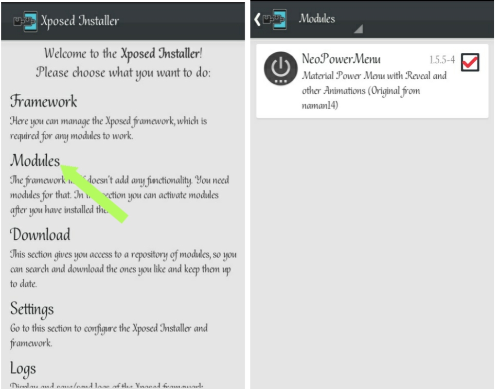 #2. After installing the Neopowermenu, open the xposed installer and click on modules, then tick Neopowermenu, go back and click on framework then reboot device to activate changes. ( Make sure the xposed installer and neopowermenu are been installed on the internal storage of your phone but this is not compulsory though).