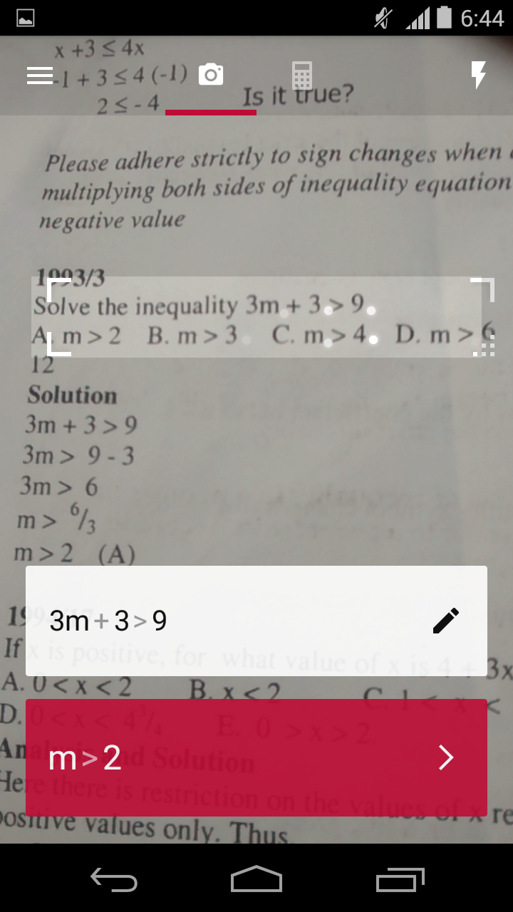 Drag to expand the rectangular shape in the middle of the screen to enable photomath in scanning more math problems, but do this with caution, as the app will try to take other numbers around the equation into calculation, thereby giving you a wrong answer. Before now, photomath deals with printed letters only, but the app can now recognise your messy handwriting. There’s a flashlight​ icon located at the upper right corner of the screen, you can turn it on during the night to enable photomath in scanning math problem.